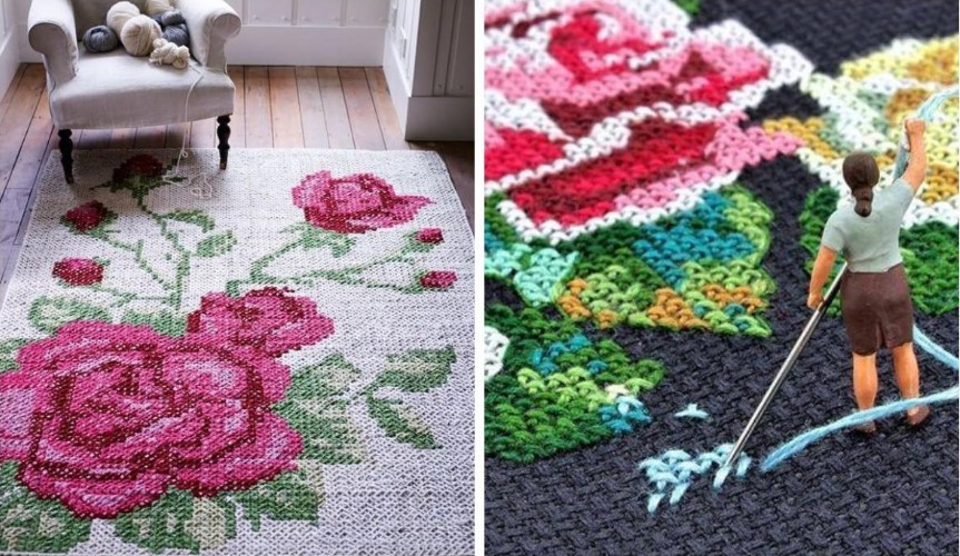 Идей удалось отыскать ничтожно мало, зато они нереально красивые. Для меня стало открытием, что коврик, оказывается, можно вышить крестиком! Наверняка это сложно или дорого, потому что фото готовых изделий практически нет. А может, немногие отваживаются покуситься на столь оригинальные модели, опасаясь, что работать придется примерно такой иглой.